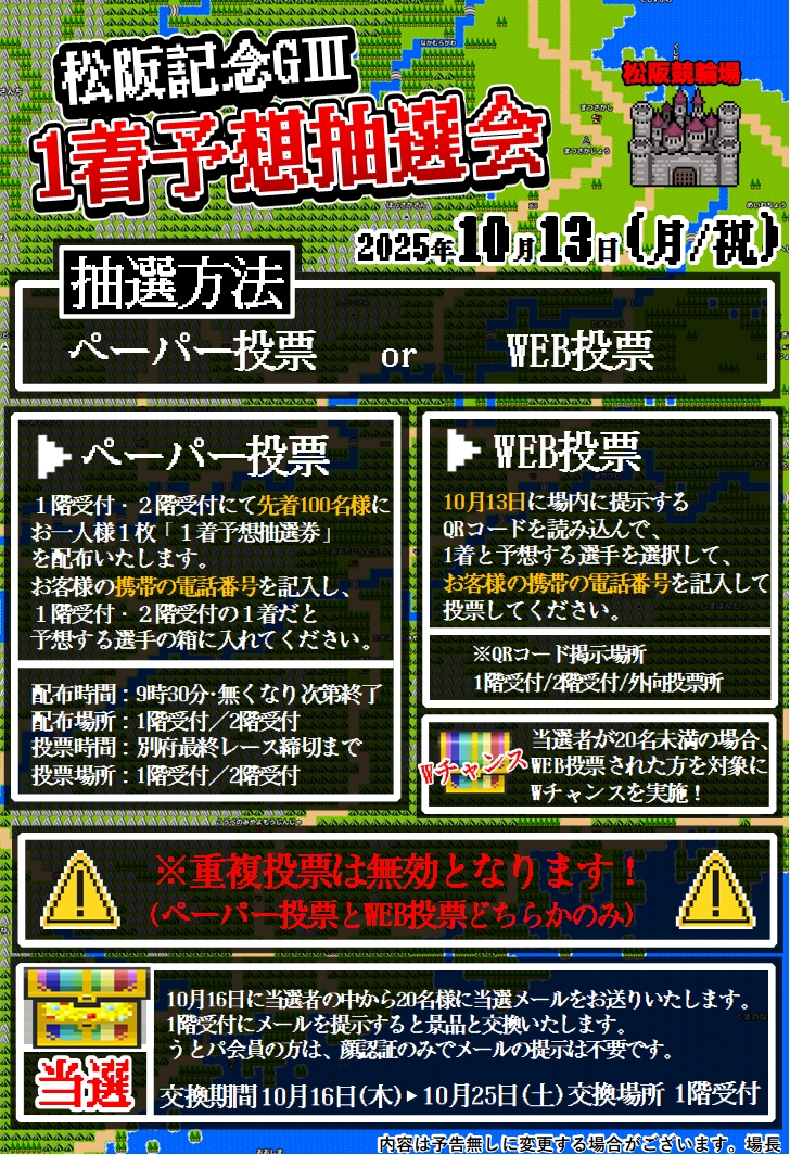 10月13日に場内に掲示するQRコードを読み込んで、1着と予想する選手を選択して、お客様の携帯の電話番号を入力して投票してください。