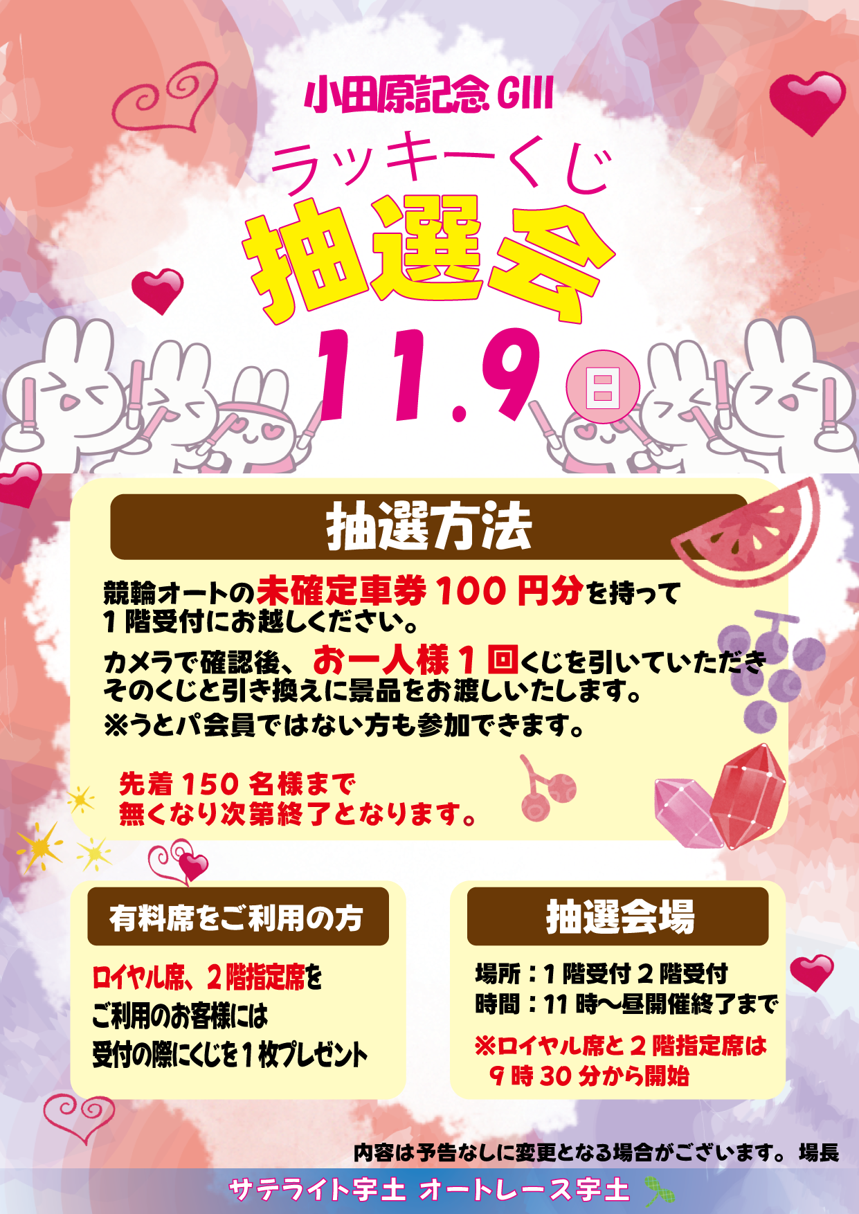 1. 競輪またはオートの未確定車券100円分以上を1階受付のスタッフまで