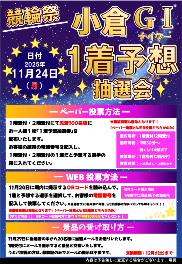 11月24日に場内に掲示するQRコードを読み込んで、1着と予想する選手を選択して、お客様の携帯の電話番号を入力して投票してください。