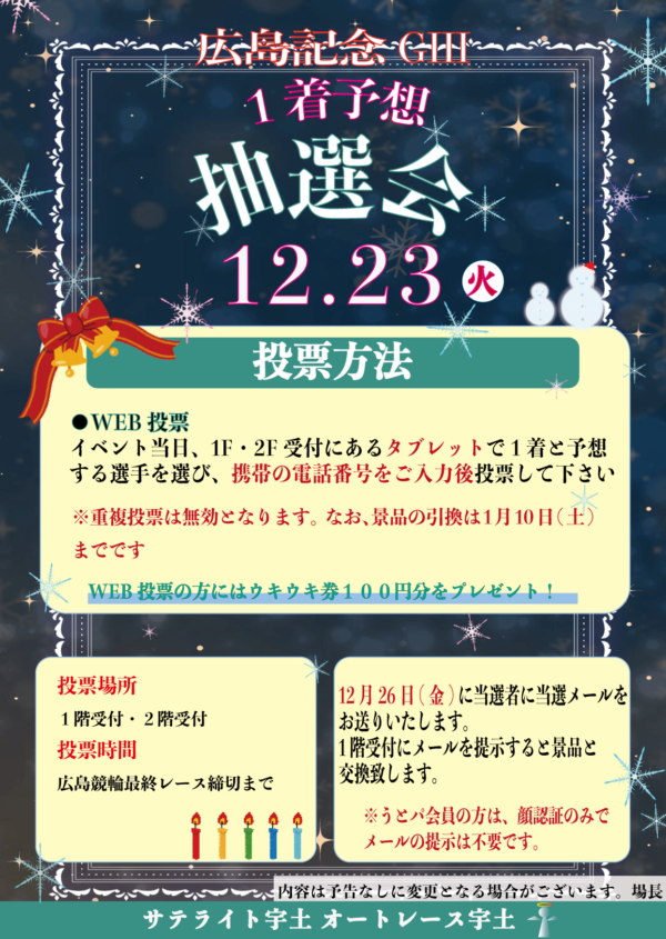 12月23日に、1階受付・2階受付にあるタブレットで1着と予想する選手を選択して、お客様の携帯の電話番号を入力して投票してください。