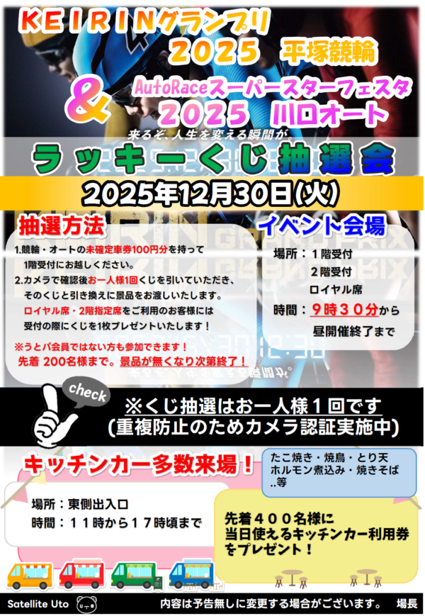 1.競輪またはオートの未確定車券100円分以上を1階受付のスタッフまで