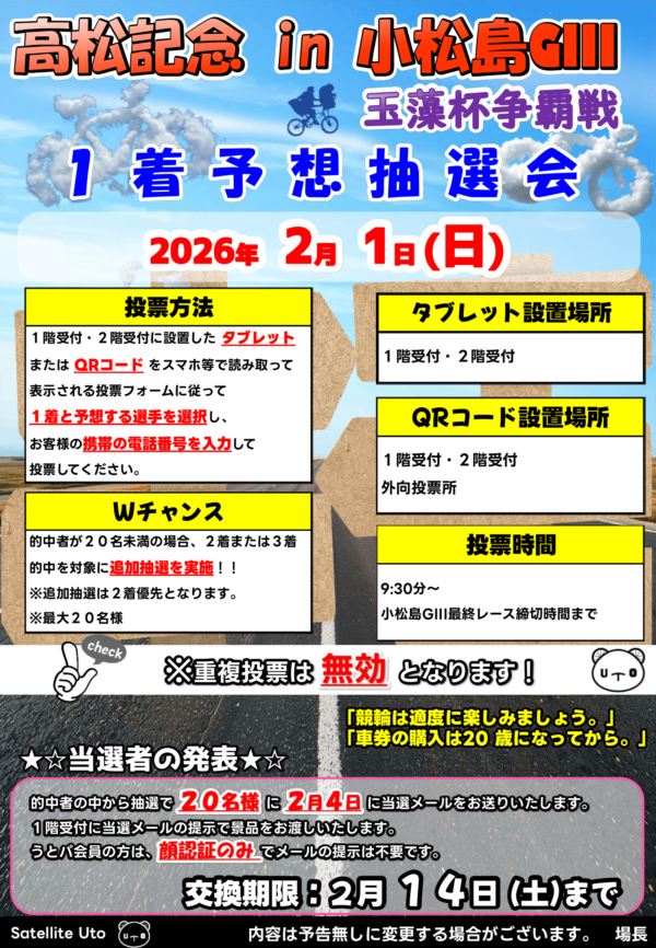 【2/1(日)】1着予想抽選会【小松島競輪GⅢ】