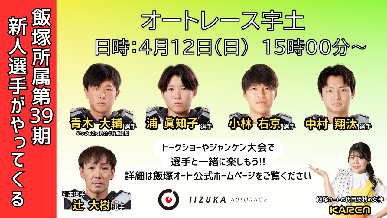 【4月12日(日)】飯塚オート所属第39期新人選手【トークショー】 2026.04.05 4月12日(日)、飯塚オート所属第39期新人選手の青木大輔選手、浦眞知子選手、小林右京選手、 中村翔汰選手のトークショーを開催します✨ また、辻大樹選手と勝利の女神KARENさんも来場予定です!✨ 皆様のご来場お待ちしております😆