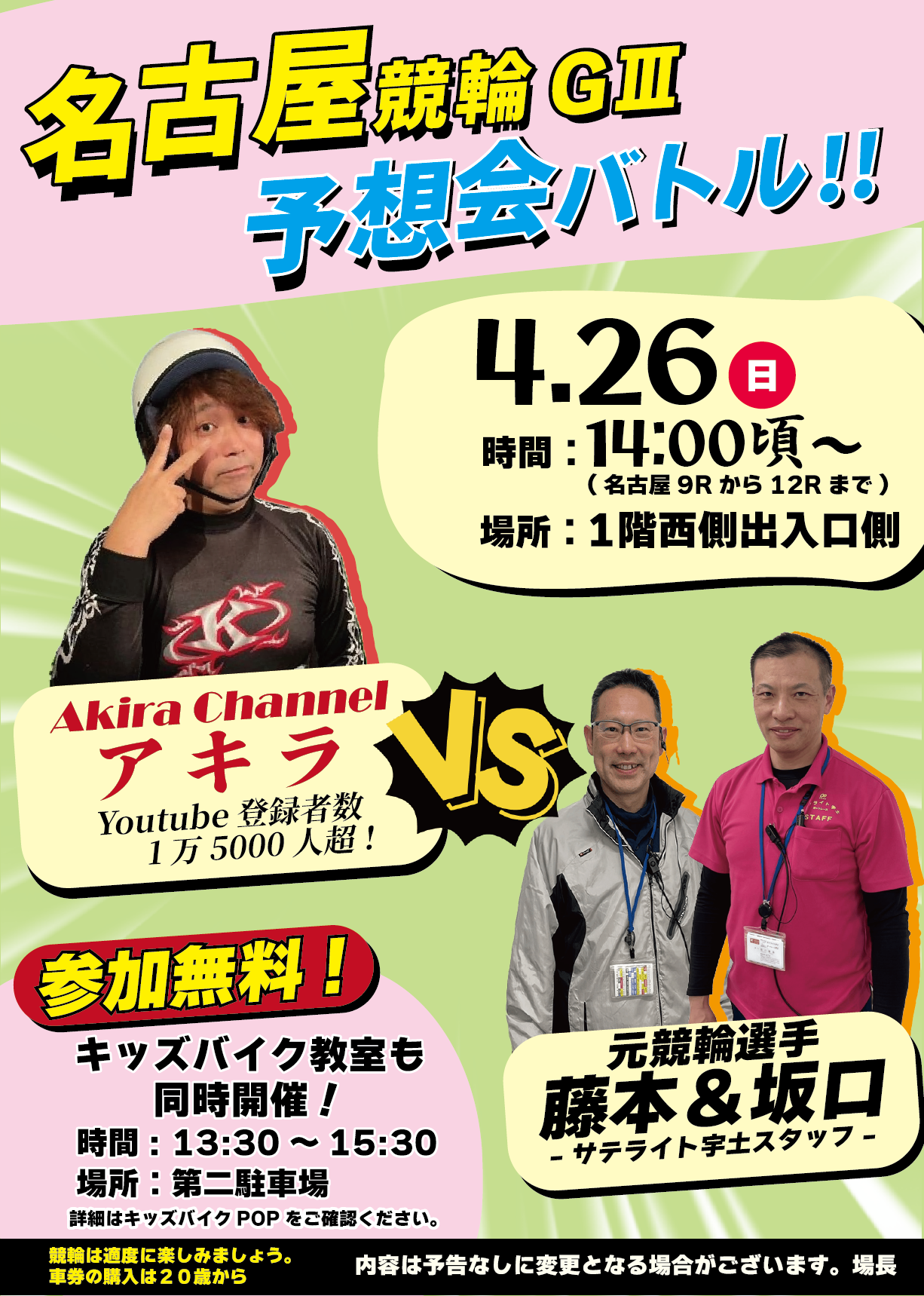 4/26(日)にYoutuber #アキラ さんとスタッフの元競輪選手 藤本&坂口による名古屋GⅢ予想会バトルを開催します🎉